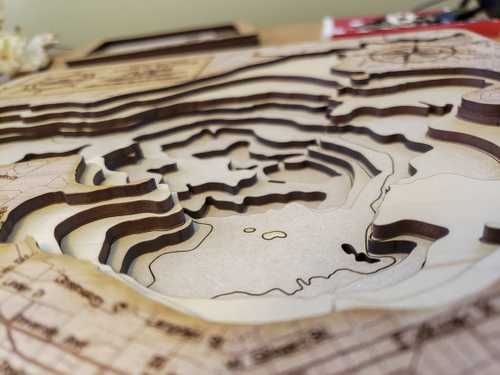 I used 1/8" material for all of the layers. I think I want to make one of these for myself, minus the award stuff. The original file is like 20 layers, as the lake goes down to over 80 feet deep. Any suggestions on materials thinner than 1/8" for use on the middle sections? Do they make 1/16" plywood or draftboard?