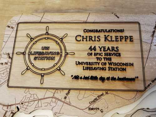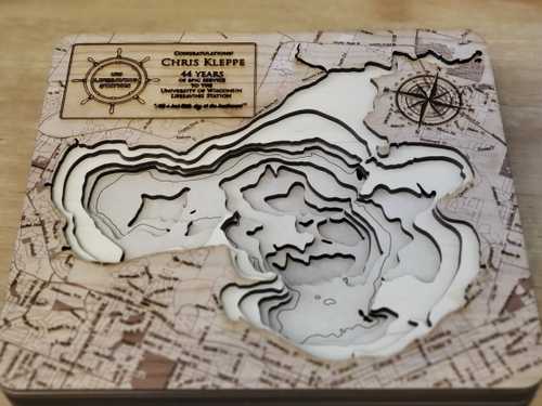 I worked at the University of Wisconsin Lifesaving Station for 25 years during the summers. I loved being out on the lake, and doing the rescue service was an epic job. One of my co-workers recently retired after 44 years, so I wanted to make him something for his retirement. I had previously did the illustrator work to map out the different lake levels in hopes of having a different buddy use his CNC machine to make me a coffee table. Now that the Glowforge is in play, I thought it would be nice to use this file to create something unique. I have to get some more proofgrade before finishing, as I skipped a few levels, but you get the gist of what I’m trying to do in the picture below. My friend that I’ve worked with for 25 years, have windsurfed, water ski’d, wakeboarded, kite boarded, snow kiting, ice windsurfing, fly boarding, swimming, etc in addition to the rescue station, so Lake Mendota is a pretty special place for us. I think he’ll like it.