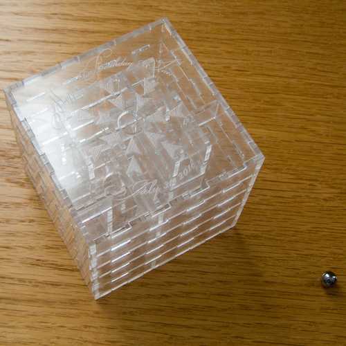 Inspired by something I saw on the forums, but can no longer find with a search, and by my grandson’s upcoming birthday, I designed and built a 3-D maze from 2.2 mm acrylic sheet. You drop the ball in the hole in the top, rotate the cube this way and that and finally – if you do it right – the ball comes out the hole on the maze’s bottom.