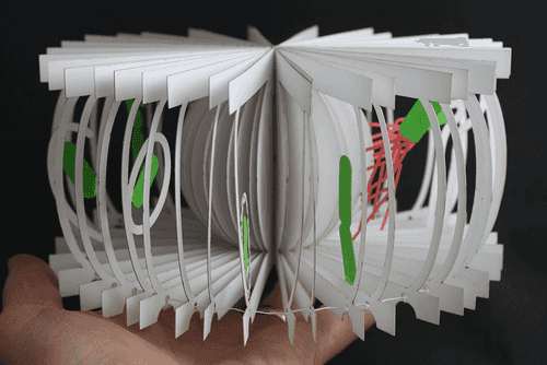 I bought my Glowforge to teach students to make props that they can use to tell quick stories. I need to give them some examples, so I made this popup book based on Usuke Oono’s 360 degree books (http://www.awrd.com/portfolios/oonoyusuke). My book tells the story of an intracellular infection, where a host cell picks up a pathogen and the pathogen then grows within the host. You rotate the book and see the progressive stages of the infection. This book shows the course of a Listeria infection.