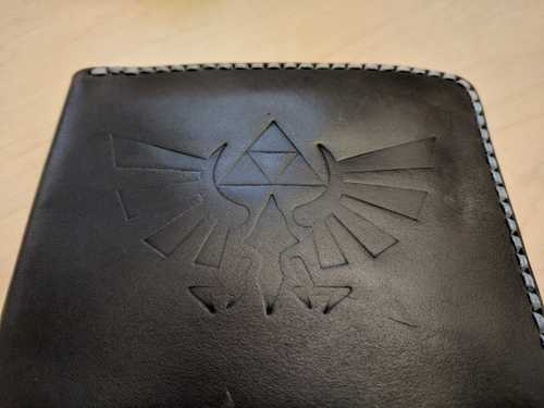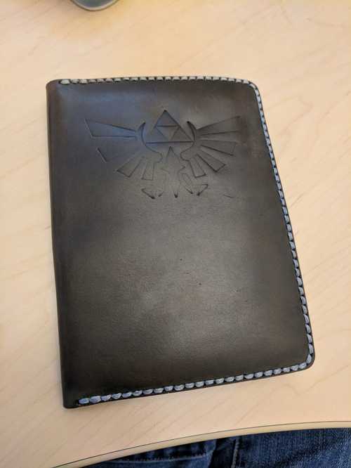 I recently made a leather wallet/field notes cover and stamped it with a laser cut acrylic stamp. I wanted the stamp to show up a little better so I decided to try black antiquing gel as recommended by the good folks at tandy when I bought the leather. This was my first time using antique gel, so I wasn’t sure exactly what to expect. He told me that it would darken up the leather as a whole, but that it would show up in the embossed the darkest. I liked the color of the leather so I originally tried to apply the gel to a localized area around the stamp. I applied the gel and then wiped it clean with first a dry paper towel, then a wet one, then another dry one. I didn’t get any good pictures, but the dye noticeably changed the leather’s color in the area around the stamp. I didn’t like this so I went back and did it again, covering the entire front of the wallet. The first area is still a little darker, but it kinda works to lowlight the stamp and isn’t as noticeable as previously. Here’s the before and after pictures.