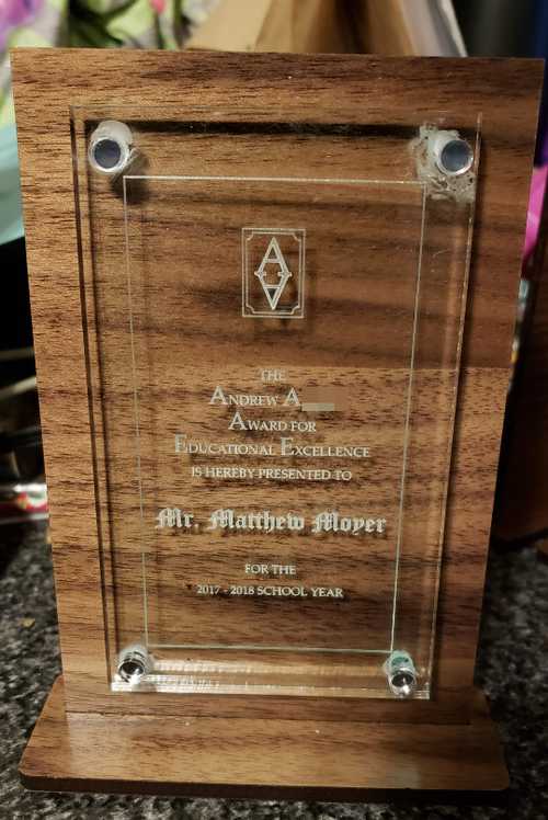 You may notice the logo up top. I asked Andy if he wanted any sort of design somewhere on the award… a book, a picture of a school or something. He says “I want you to design me a logo. If you were going to design me a logo, what would it look like.” I said “Andy… I’m not a designer. I’m not a graphical artist.” But he insists. So, in a minute or two I whipped up an Andy A… logo. To my surprise, he loved it and said we absolutely had to use it. So we did.