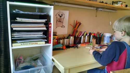 Hopefully this will help keep construction paper and sticker books off our floor.