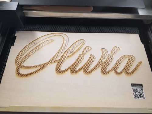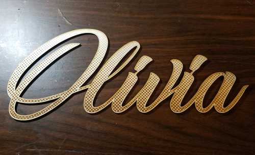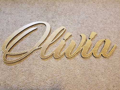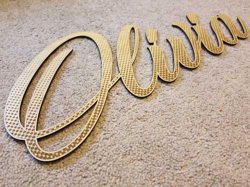 I created a vector outline of her name using Illustrator, and connected things manually with the pen tool where I needed to in order to make a 1-piece cut out.