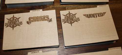 So, I decided to make dividers for the box. I took some measurements, snagged some logos (which I then converted to raster). 3mm hardwood or acrylic was going to be too thick, as with the latest game expansion, the box is already quite full! Thankfully I had some nice Cherry veneer that I could work with! I haven’t taken the sticky-back off yet, but at some point I’ll probably cut a backer out of card stock or even just paper to stick to the backs.