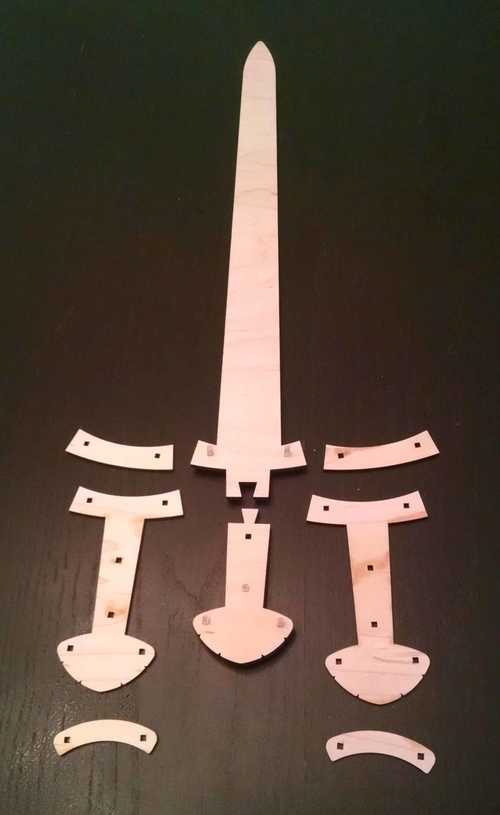 First, the CAD linework. The sword is built up of five layers of wood. The center layer (the blade) is 1/4" plywood while the hilt is built up layers of 1/8" hardwood. I planned to fasten the layers together with square pegs and glue.