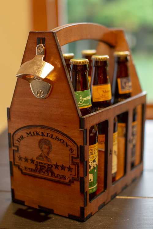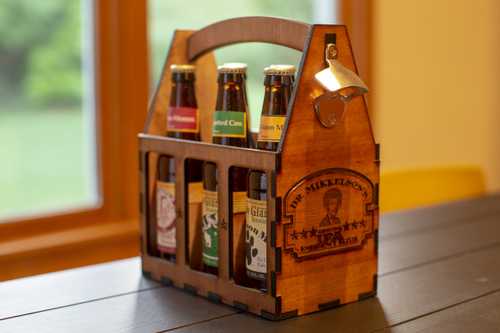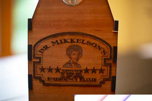 Since Father’s day is right around the corner, I thought I would make a beer caddy for my dad who loves IPA. This is also my first attempt at making a tabbed box, and I used the inkscape plugin to create the base box and then imported into Illustrator to make the rest of the modifications. I ordered a pack of wall mounted bottle openers from Amazon, as I knew that this probably wouldn’t be my last caddy. I engraved “Dr. Mikkelson’s Genuine IPA Emergency Elixir” on the sides with a old picture of my dad from the 70’s. I used Owyn’s Hickory for the outsides, and some Owyn’s Mahogany for the dividers. The pieces are really tight, except for the handle, which I messed up on the slot for the width, so there is a little play. I did not use masking, as I wanted that burned patina look, and I’m happy with the results.