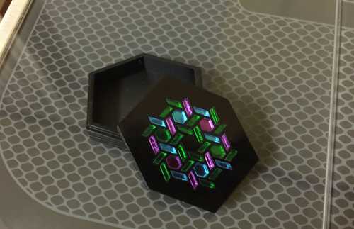 All of the little sides of the tray and the black box show a slight difference from top to bottom, and that is because the focal point was set at the base of the acrylic. If it is set in the center, there will be a different profile on it, but it will still be uneven. That makes it hard to stack layers and get a uniform profile…it has a ridged look. (There’s a lot more experimenting to be done there.)