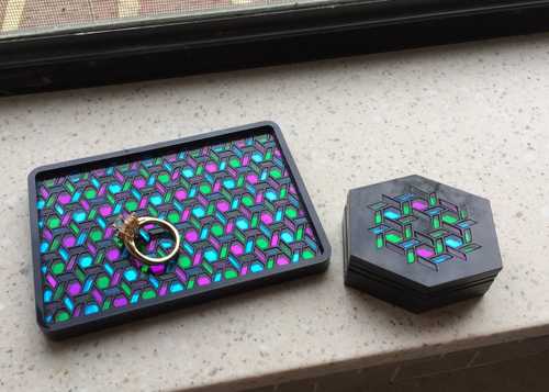 I created a little pattern last week for some inlay and to see if kerf adjusting the design worked - couldn’t figure out what to do with it, and finally settled on making a little jewelry tray - the kind that Southern gals keep above the sink to hold their jewelry while doing the dishes or talking on the phone. (I don’t know, Northern gals might do the same thing…my mom has always had one next to the sink, and since she’s into bling, she’ll probably get this one.)