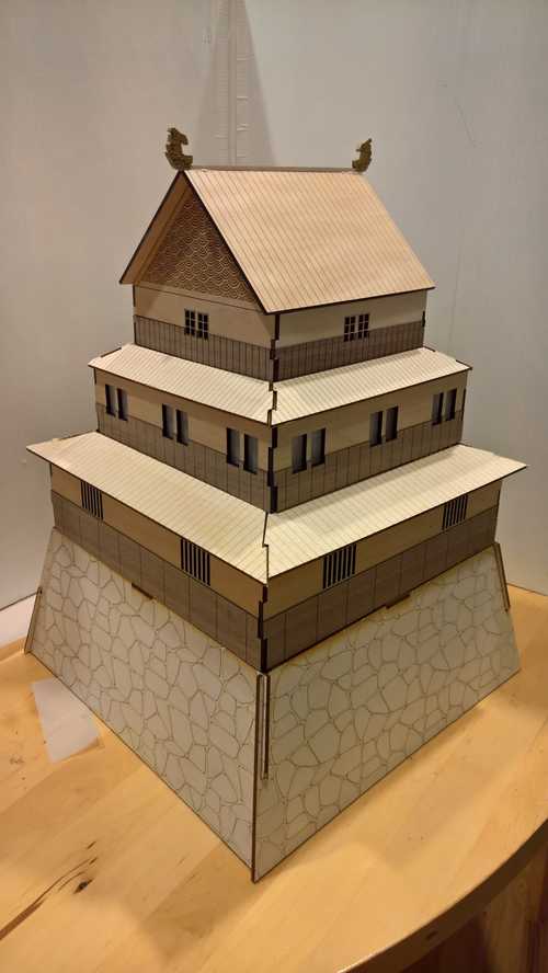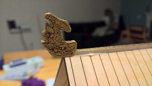 She looked around the web for pictures of the fish that usually go on the tops of the castles and once she found one traced it and made a piece that would glue to the top of the roof and hold them in place. It was a raster image in a vector cut outline. We tried two variants of the raster image to see which looked best and ended up with this one.