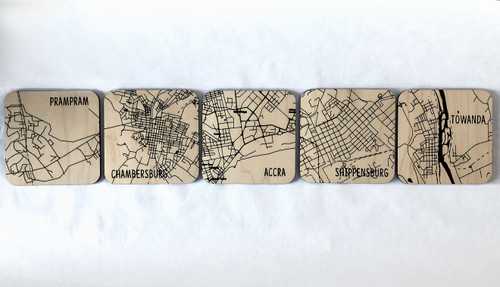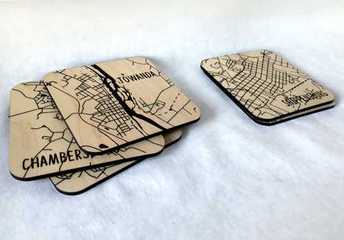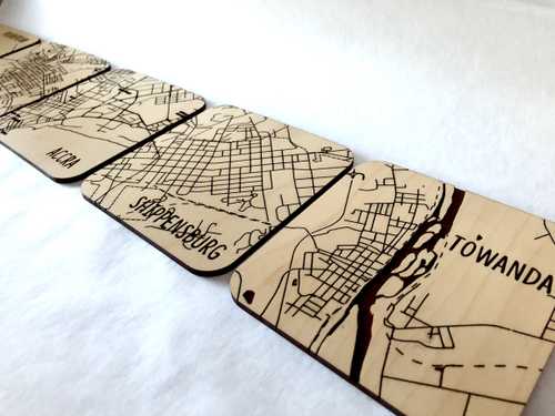 I made these 4x4" coasters for my mom with the road maps pertaining to the locations of family. Really dense city centers with the close together lines typically burned or crumbled out of top layer of plywood. All line work was “scored” and the text and river were engraved. Typical time was 12-20 minutes.