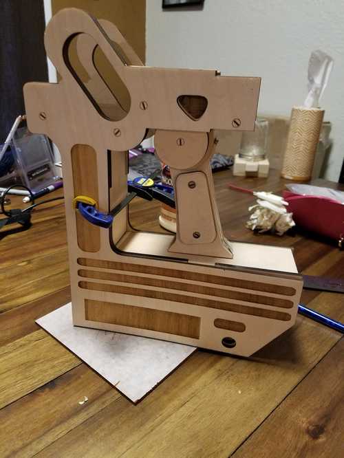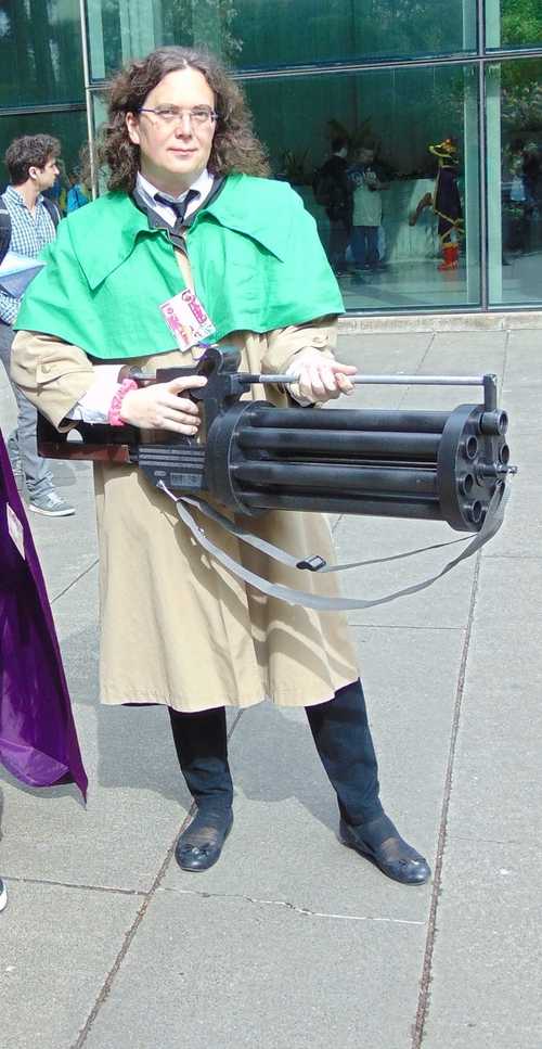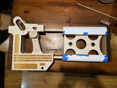 I know I’ve been quite for a bit but life has been quite busy. My daughter and I go to an anime convention every year and we both cosplay. This year I decided to cosplay “Stun Gun” Millie Thompson from Trigun. I tend to pick my cosplays by their props and this was no exception. Her multi-barrel non-lethal gun was a lot of fun to build and got a lot of remarks at the con itself. 90% of this build was made from plywood cut with the Glowforge.