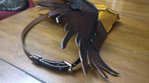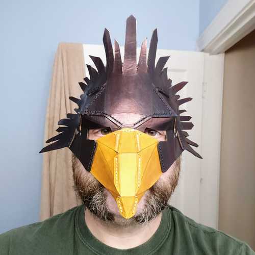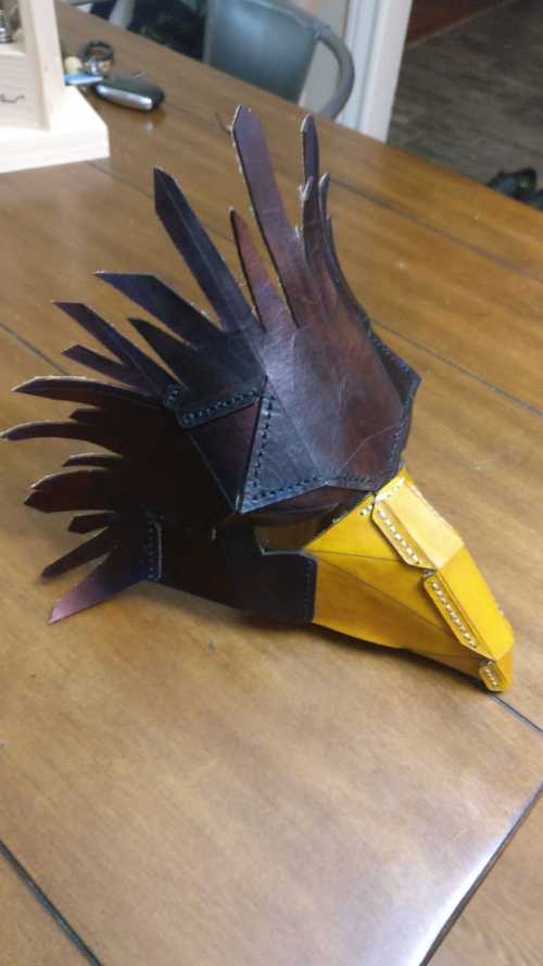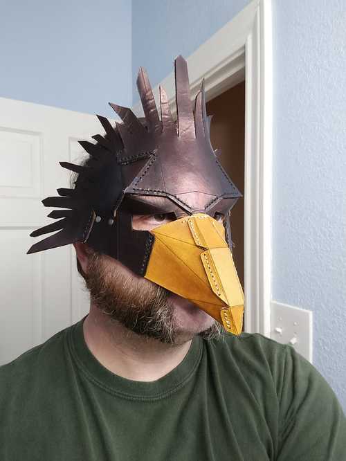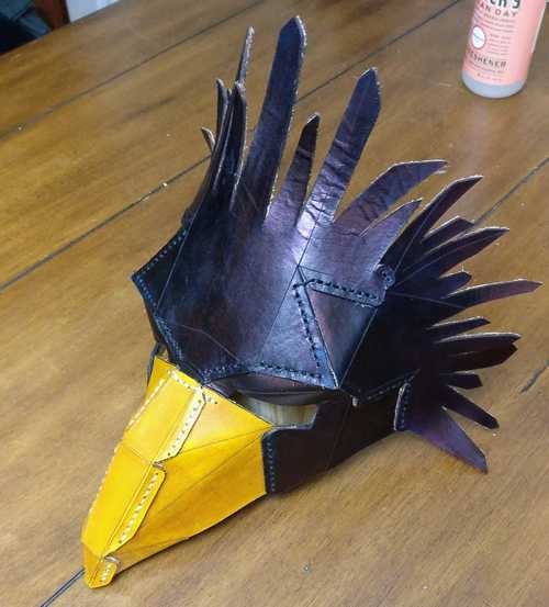 And now for the final product. Riveted the leather straps on and voila. I have a Low poly raven mask made from leather. Thank you