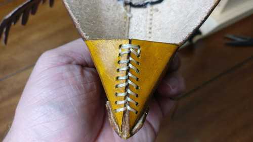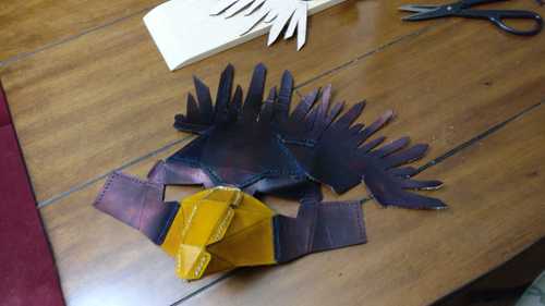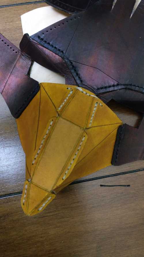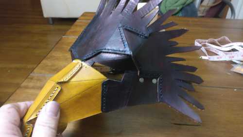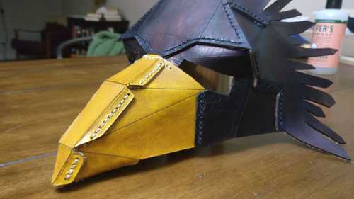 My fingers are so sore. Even with holes, the process of sewing leather is arduous. Also, due to the shapes in the mask, beak, eyes, etc. I couldn’t use the saddle clamp for most of the work. This made it a bit tricky, pulling thread with my mouth while holding the mask and other needle in my hands.