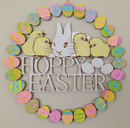 Here, just in time for Easter, is the assembled wreath in all its DayGlo glory.