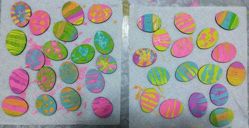 The eggs for the outside were indeed very easy. I traced a photo of a few different real eggs so that they would have a natural look, and scaled them to real world size. Then in no time I cut out a big sheet filled with them, and that night my three year old and six year old daughters were happily painting eggs with their crayola acrylic paints. Here is their handiwork: