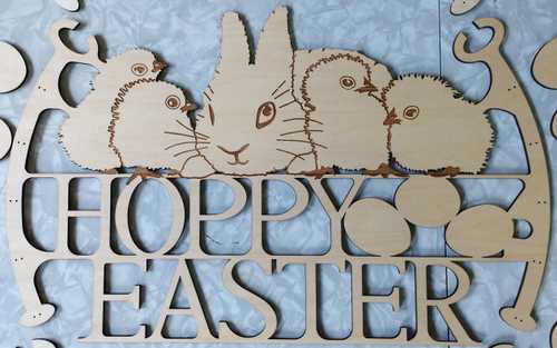 I started by quickly drawing some chicks with smooth lines, but it turns out that if they aren’t fuzzy, chicks look like tiny dinosaurs with murder in their hearts. So next I drew a fuzzy chick and did a test print, but found that I had made it too fuzzy for the material; the tiny bits of wood were charred. So I did another test, and another, and at last got the scale of the fuzz correct. Then I moved on to the other chicks and the bunny. Finally I took a page from Disney and scaled up all of their eyes, but not their beaks, and made all of the features a little more round. At last, some cute chicks!
