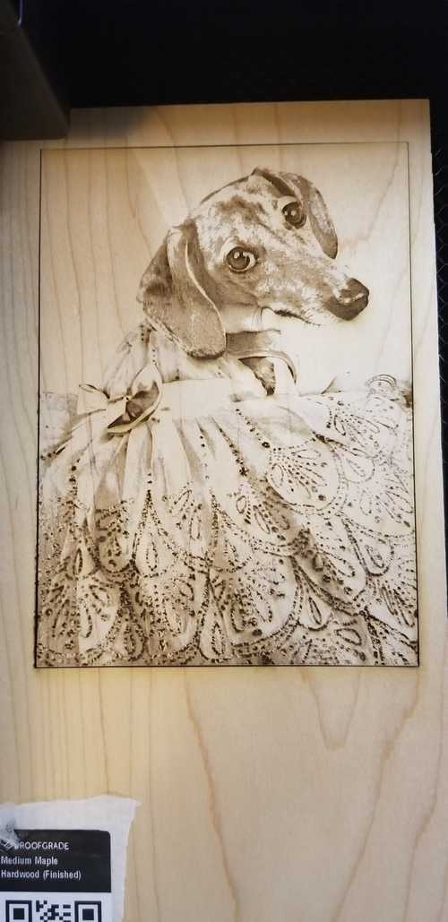 So one of the reasons I bought the glowforge was to engrave photos. I work at a pet resort and we do photography there as well as I do my own work doing weddings and such. So I decided to engrave a photo of one of my boss’ dogs. She absolutely loooooves it! I ended up taking off the protective sheet though. First engrave I did looked super nice until i took the tape off. It took all that extra detail off. But I had to do very little cleaning on the wood and it looks super nice :). It took a lot of trial and errors though. It was hard for me to go so drastic with the brightness and contrast considering that is a big no no when editing regular photographs @_@.