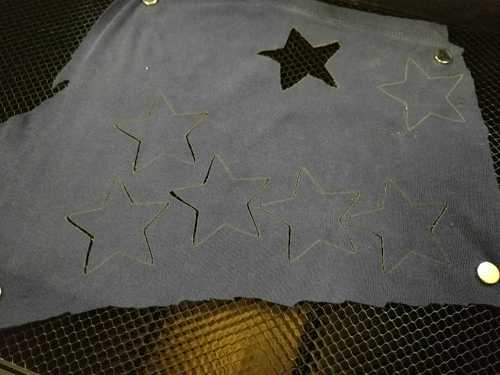 These magnets had sticky backs, but really they aren’t needed - they’re friction fit, and it took a hammer and a 1/4" dowel to drive them in. Finally, I took some old pants my daughter had worn through the knees on, and lased some cotton backs for each star: