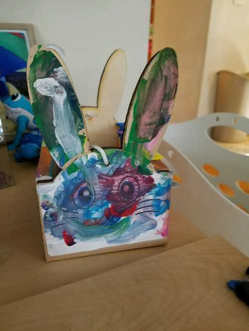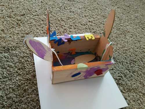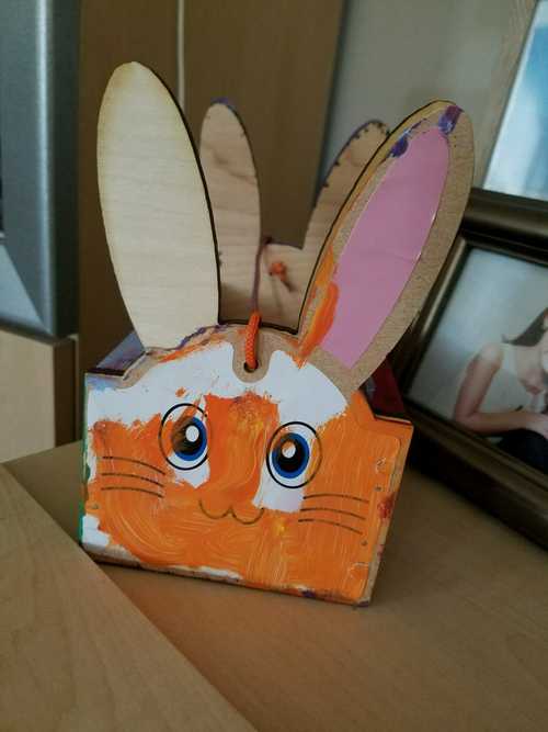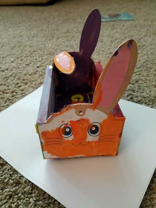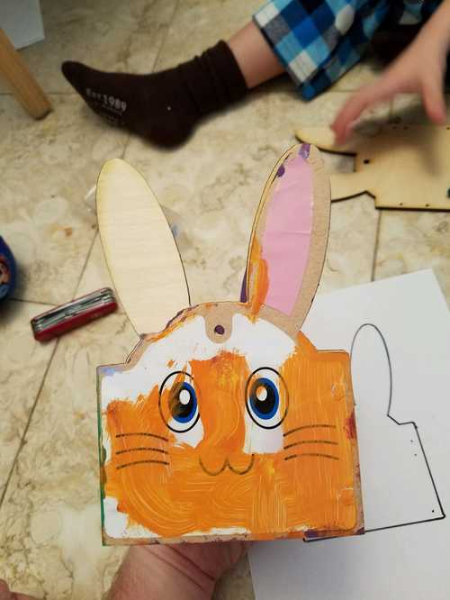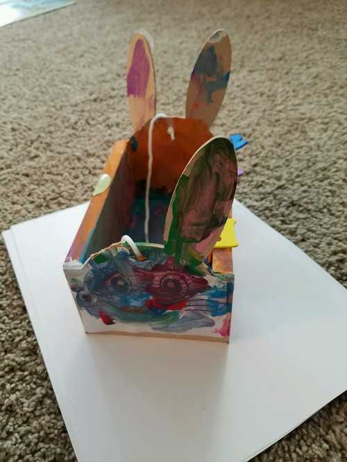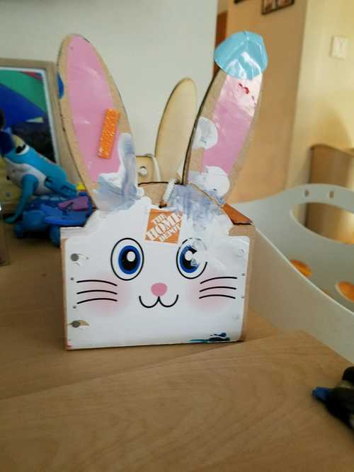 Well, the face (and of course the ears) were made of that paperboard, and as y’all can imagine, those don’t last long with 2 rambunctious boys. One ear had snapped before we even left the store…as did another child’s next to us. So we asked for another kit and each took one replacement bunny face…