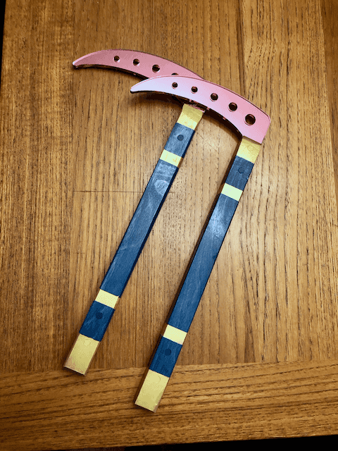 My granddaughter’s “weapon of the quarter” in karate is the kama. Hers didn’t come in on time for some reason, and will be further delayed because of the holidays. That meant she didn’t have them for the first class where they started learning to use them. The instructors had a few loaners, but there weren’t enough to go around, so she only had one to practice with instead of a pair. She’s a trooper, and took it all in stride, but Grandma has a Glowforge (and some lovely rose-gold acrylic that was begging to be used!), so now she has a practice pair to use until the real thing gets here.
