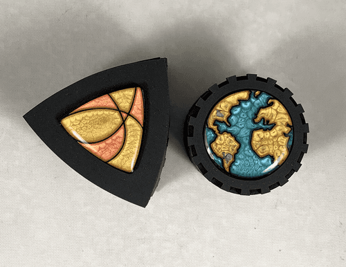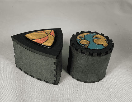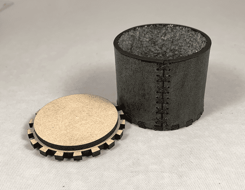 It seems I just can’t get enough of these resin medallion boxes (see my previous post). This time I made the sides of the boxes out of Proofgrade thick leather, for easier bending. I did not score the insides at all. The leather was dyed black before cutting, then remasked. The Draftboard parts were painted black with black gesso.