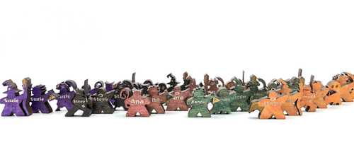 As part of a gaming birthday party my husband and I designed a variety of different meeples (game pieces to represent you for scoring or other tasks during a game). We were tired of the standard people shaped meeples and wanted some that are more fun and with our names on it, because seriously, sometimes it is hard to remember what color you are playing in a game if you play lots of different games. Making a few as favors quickly expanded into making family sets for friends. Some are sets where each person has a full set of meeples, one of each color. Each characters is assigned a color so you don’t overlap. And some sets allow each family member to have their own color and and can choose which character they feel most like playing that game. These sets are also helpful for games where you control more than one meeple. Now any game can turn into an epic pirates vs ninjas battle!