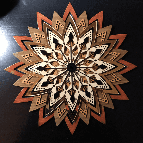 The layers are (back to front) mahogany-stained Baltic birch, PG walnut ply (lightly sanded and sprayed with laquer because the finish wasn’t quite “finished” enough to make me happy), PG cherry ply, gold mirrored acrylic, PG maple, and PG black acrylic.