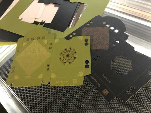 The Glowforge has been running perfectly so far and along with a sundry of little toys, emblems and such for my kids (draftoboard is awesome btw) I have been experimenting with paper cutting. As many of you might know, I run Encarded.com and produce highly collectible playing cards, and the forge is going to play a key role in letting me develop intricate limited edition boxes and collectible items for my card collectors.