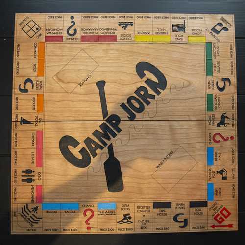 In 1991, I worked as a camp counselor at a summer camp in northern Wisconsin. Best summer of my life. I have been volunteering for them ever since. I am currently on the board of directors, and our annual Strong Kids campaign raises money for those kids who normally cannot afford to go to camp. I’m not very good with the ask and trying to get contributions in the traditional sense, so after creating the Star Wars Monopoly board, I decided to make one specifically for Camp Jorn, and raffle it off. This one took significantly less time than the last, but still a ton of work. Here is my 2nd Monopoly board: