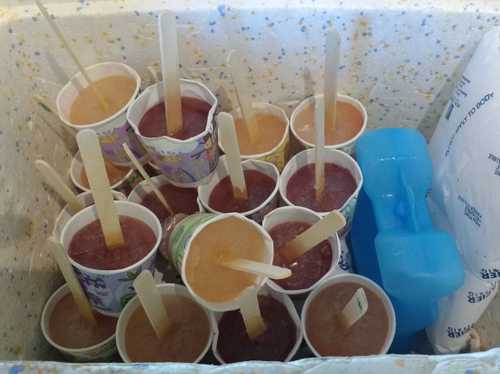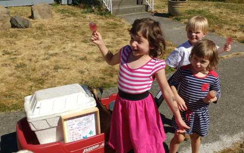 It took me a couple of tries to get the design right. At first I sized the lids to fit snugly on the cups and around the stick, but they was way too much of a hassle to remove once the popsicles were frozen. So I loosened up all of the tolerances, and we started freezing our popsicles in two layers to keep the stick from going all the way to the top. (Two layer popsicles are more fun anyway.) Here are the finished results, and the kids heading out to make their first sales. They were too excited to stand still for the picture.