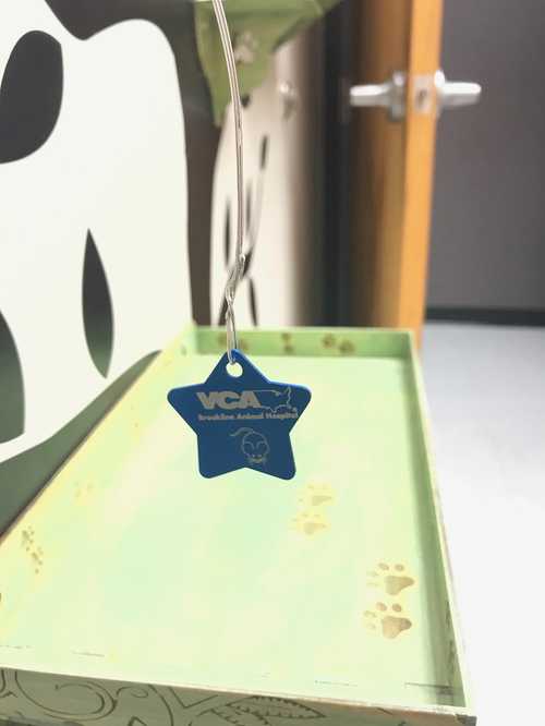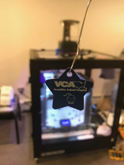 So first engraved the hospital logo (and a mouse) on an anodized dog tag (figured a star shape would be interesting to a cat)