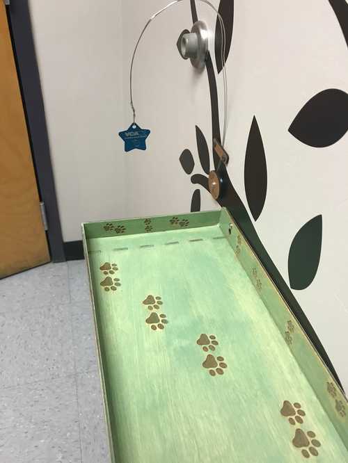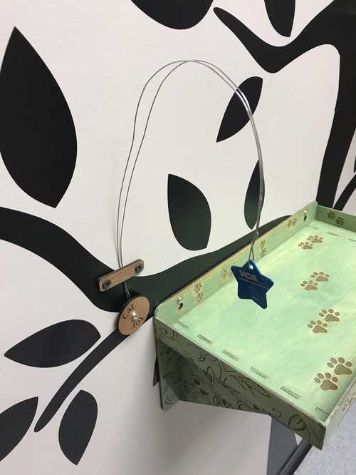 As the final touch for the Cat Perch project we figured we needed some sort of cat toy, so I had the idea to hang a dog tag in front of the shelf. So i put a mouse on one, but one of the staff suggested I put the hospital logo so when anyone takes a picture of their cat, it will have the hospital info on it.