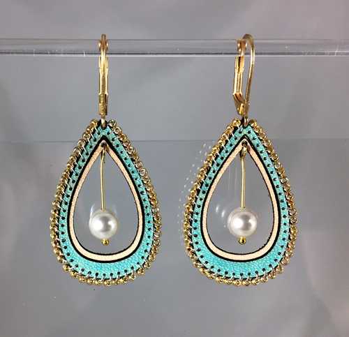 After making two that matched, I peeled off the outer masking and colored the leather with a light blue Copic marker. Then peeled off the inner masking (that’s the natural leather color). Then stitched a bunch of 15/0 gold seed beads with 6 lb Crystal Fireline, added some Swarovski pearls on gold plated ball headpins, added leverback earring findings and there you are: