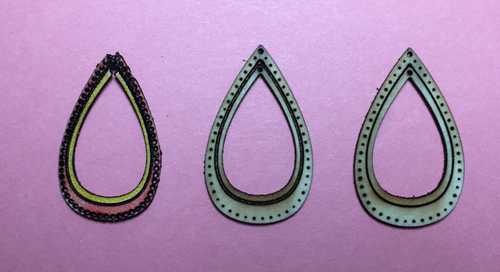 These were cut from Proofgrade Standard Leather (I think it’s the medium size). The one in the middle was scored with the dark setting which was too strong–it mostly burned through the leather. The one on the right used the light setting (still a bit strong but they are still tweaking).