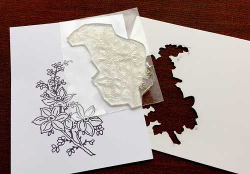 Anyway, I also created a 1mm border outline cutout, and cut that out on the laser from Bristol card stock. Here is the stamp, a stamped image from the stamp, and the border outline cutout: