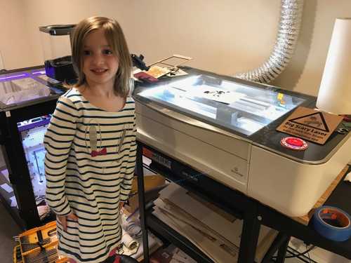 The 5 year old took it all in stride that you could even do this (I mean sure why couldn’t you just laser cut something you draw?). Once I traced her drawing, we cut it out of cherry (first piece of proof grade that came out of the stack) and then I ran over to illustrator because it really needed to be mounted, and cut a rectangle with her name (misspelled since I let her spell it - right letters wrong order) and the CA glued the drawing (her holding a balloon with a card saying love next to it) onto the maple square