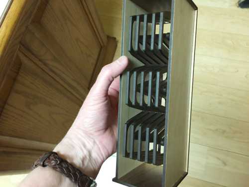 The file uses a shallow mortise and tenon treatment (with glue) to hide the construction. The fun part is the interior fins…I wanted to do something different with them, in case I want to play with putting a clear side on the box some day.