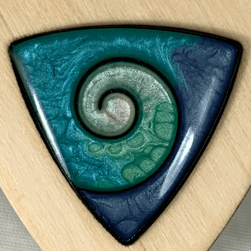 I used the Glowforge to make the center medallion as well. It’s two layers of black acrylic, with the lines that form the walls cut and glued on the bottom solid layer. Then filled in with an iridescent paint then domed with two-part epoxy resin. The middle of the lid is engraved to make a slot for this piece.