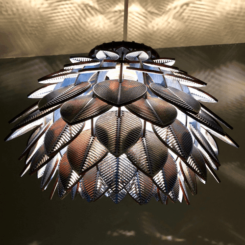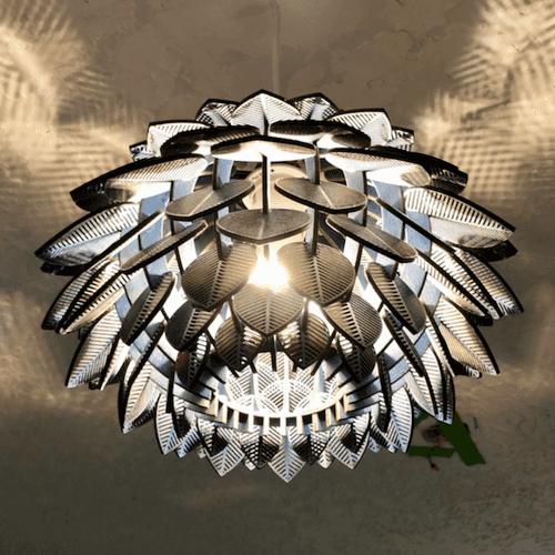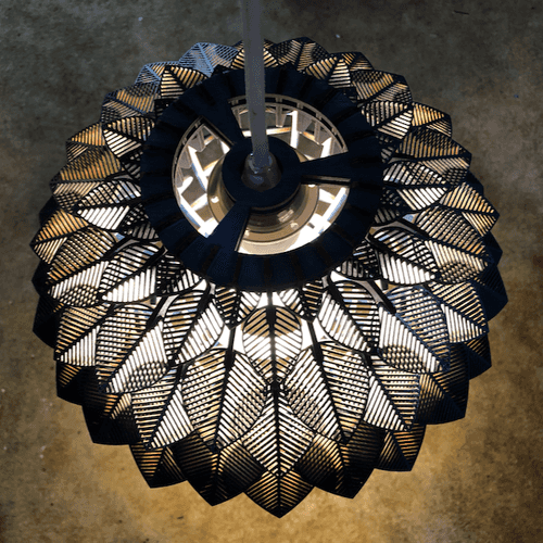 The pattern didn’t have a size reference, so I just sized it by the slots, making it so it would work for 1/8" Baltic birch. That came out about the size the description gave, but the hole for the light is pretty small. I stuck an Ikea pendant light in it, but had to disassemble the socket wiring to put the cord through.