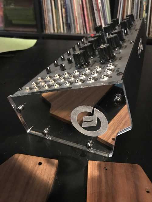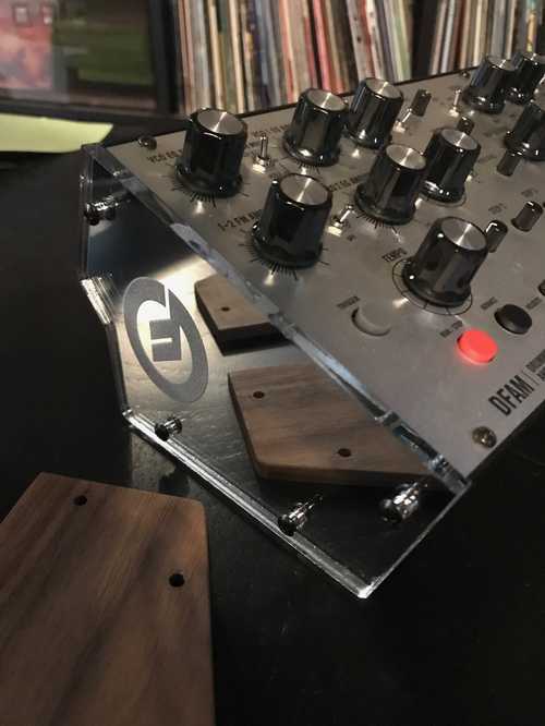 I’d been toying with a design for the end “cheeks” of a synthesizer I own, but had intended to use wood. A few revisions (a lot of revisions) later, I now have some snazzy new bling! You can see the stock wooden end-pieces laying on the table.
