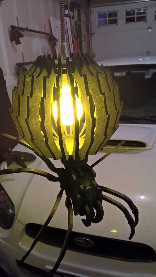 I always love making stuff for Halloween. Since my girls are old enough to handle most of their own costume work these days I decided to work on something for decorating the house. At Bay Area Maker Faire this year I saw a really cool lamp design by the folks over at Full Spectrum lasers. Since they were kind enough to post svg files on their website under the project area I decided that was a good place to start. I did a few modifications to make the design a bit more to my liking (adjusting scale, making the globe a bit spookier looking, etc.) I grabbed some 1/4" plywood and started cutting on the Glowforge.