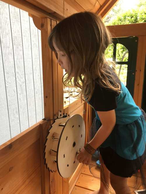 I made a quick design in Inkscape and using 1/4" plywood from Invetables I cut out the spool. Then using spacers, pulleys and bolts I had on hand, I attached it. I used a zip tie as the stop so that it would give if she put to much weight in or a kid caught on the string.