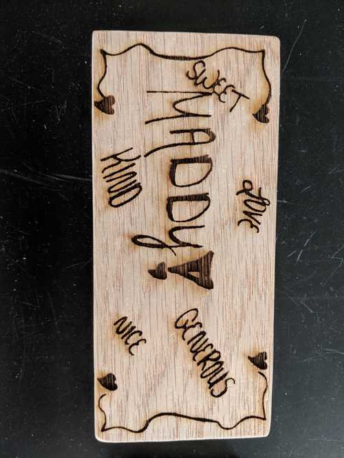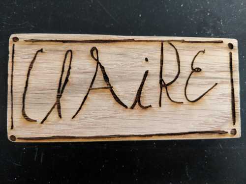 After many months of waiting our school Glowforge arrived just before Easter. After a few preliminary tests I devised a project to test the trace and print feature as I begin to learn how to use Inkscape. I decided on allowing the students to create a name plate. They drew 3 different designs and got to choose 1 design that we printed on 2 1/2"x 5 1/2" x 3/4" Oak.