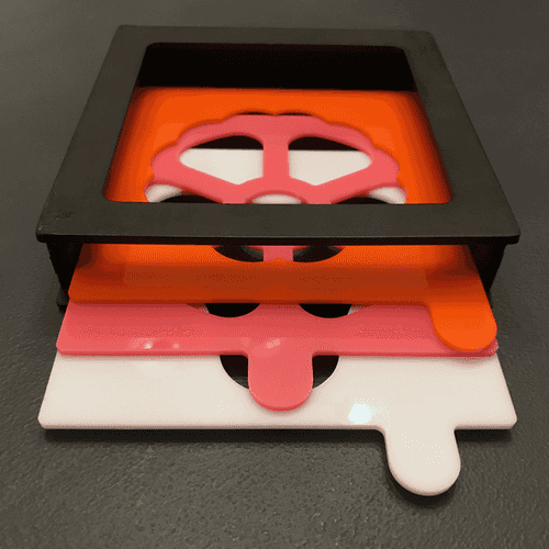 While this one is just a prototype, I’ll be making the final plates (with some different designs) out of a rainbow assortment of frosted, iridescent, and mirror acrylics from Inventables, along with clear frosted. I’ll probably keep the holder draftboard, but might go with an unfinished hardwood for the front and back layers.