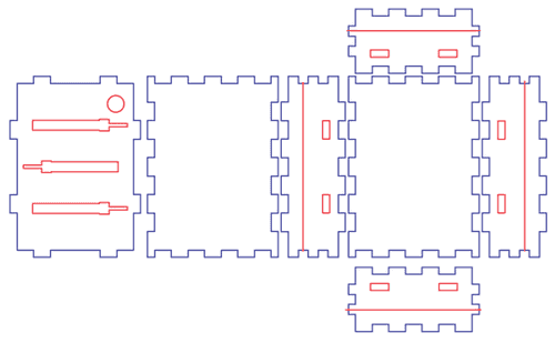 To get the basic box I used the http://makeabox.io generator from Glowsmith @kigster. It worked great for this application and the symmetry of the notches made a big difference later. I brought the PDF it made into Illustrator for further manipulation and in short order had something that looked like this.
