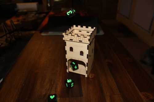 My friend said that he didn’t really like the tray that catches the dice, so for this version I took it off, which makes the tower itself that much more compact. I was a bit worried about stability, but after several dumps of the King of Tokyo dice through the tower this morning, I can say that it’s pretty solid!