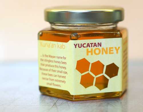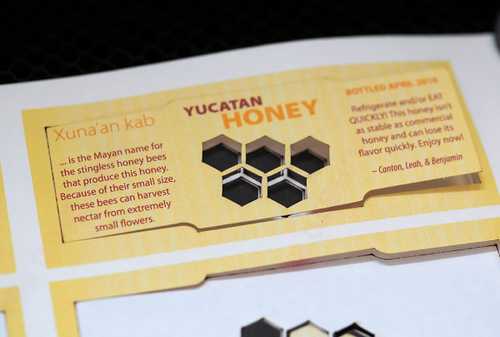 We brought back some bottles of honey sold by Mayan villagers in the Yucatan. They sell it on the roadside in unlabeled 1 liter plastic bottles. I wanted to make the honey more presentable for gifts, so I made up a label for inkjet printing on 8.5x11 sticker paper. After printing, I sprayed with Krylon Preserve It to make the labels waterproof. Then I set the sheets in the laser cutter, fooled around (a lot) to get the alignment right, and then cut out the honeycomb pattern on the front and the general sticker shape.