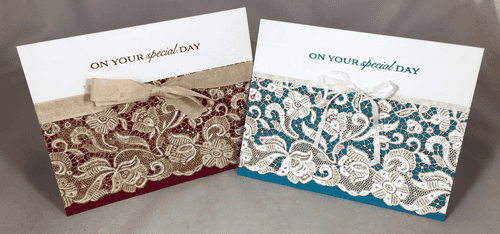 What I did was pull a public domain lace photo (it was this one) into Photoshop, posterized it to 2 colors, bumped up the contrast, and engraved in white card stock using paper engrave settings found in Beyond the Manual. For the one on the right, in Photoshop I also selected (non-contiguously) the white, expanded selection 1 pixel, then filled with white, to reduce the detail and give me the result I was looking for. The lace cutouts were backed with colored card stock and stamped with a greeting, then ribbon was added.