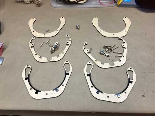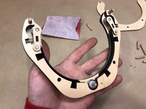 The first prototype was a simple C-shaped ring with captured bearings to let one disc turn in front of the other. The discs are transparent acrylic and look really cool when turned.